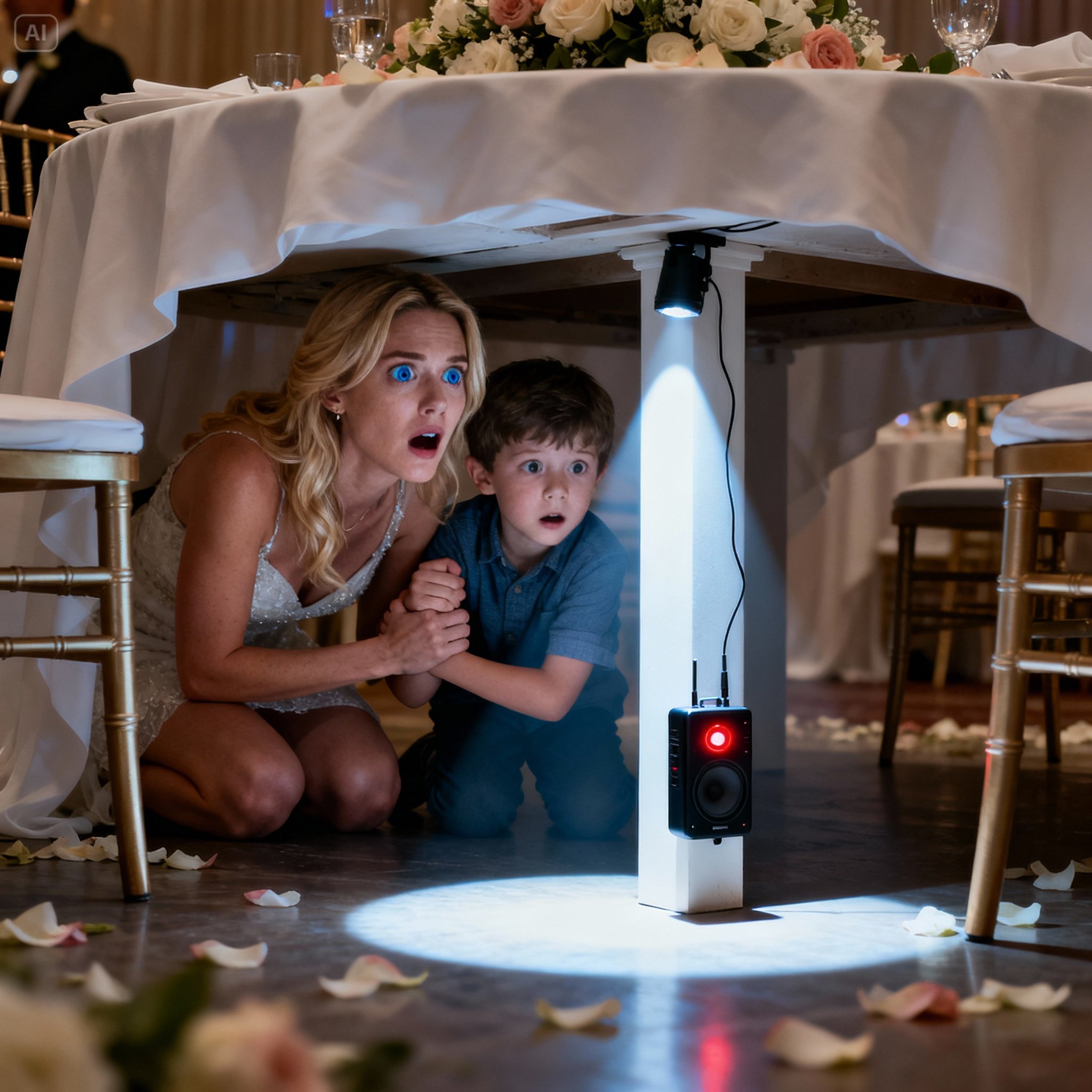 Pressed against the table leg, half-hidden behind the drape, was a small black device, no larger than my palm. A blinking red light pulsed steadily, and a thin wire curled beneath it like a tail. It looked unmistakably like some sort of recording device—professional, compact, deliberate. And it wasn’t ours.